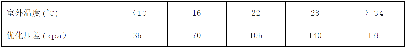 6)冷凍水泵的電機由變頻器控制,使冷凍水系統(tǒng)供回水壓差滿足空調(diào)負荷變化的需要。優(yōu)化前根據(jù)冷凍水流量供回水壓差設在100kpa~370kpa,偏高;優(yōu)化后的供回水壓差則是根據(jù)室外溫度設在35kpa~175kpa,見表2。由于供回水壓差降低了,節(jié)約了水泵電機用電量。