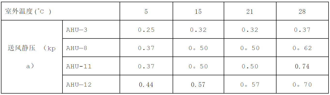 7)優(yōu)化前AHU—3、AHU—8、AHU-11和AHU-12的送風溫度在整個夏季都是13?C,這個溫度值是設計值,即滿足最大設計負荷要求。但從節(jié)能角度考慮,送風溫度應該隨空調(diào)負荷變化,即在部分負荷時適當提高送風溫度,以節(jié)約冷量。優(yōu)化后的送風溫度與室外溫度間的關系見表3。
